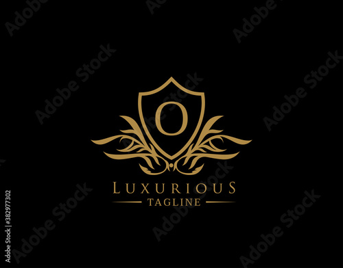 Classic Shield Logo With O Letter. Elegant Shield badge With Floral Shape perfect for fashion, Boutique, Jewelry, Hotel, Restaurant.