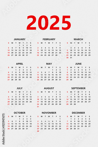 Classic white and red monthly calendar for 2025 in vertical format. Minimalist square calendar.