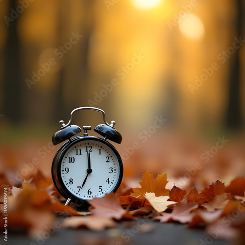 Classic White Alarm Clock on Autumn Leaves with Falling Maple Foliage – Seasonal Time Concept in Fall Atmosphere