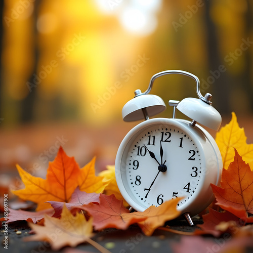 Classic White Alarm Clock on Autumn Leaves with Falling Maple Foliage – Seasonal Time Concept in Fall Atmosphere