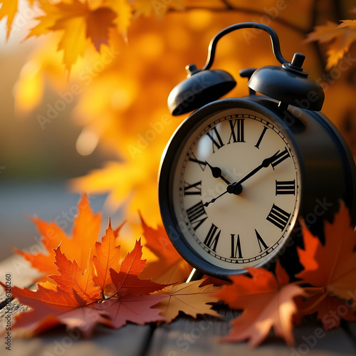 Classic White Alarm Clock on Autumn Leaves with Falling Maple Foliage – Seasonal Time Concept in Fall Atmosphere