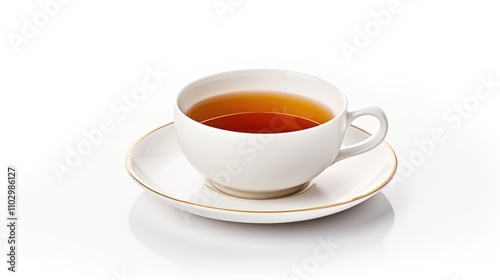 Classic white tea cup with saucer filled with rich amber tea on a pristine white background