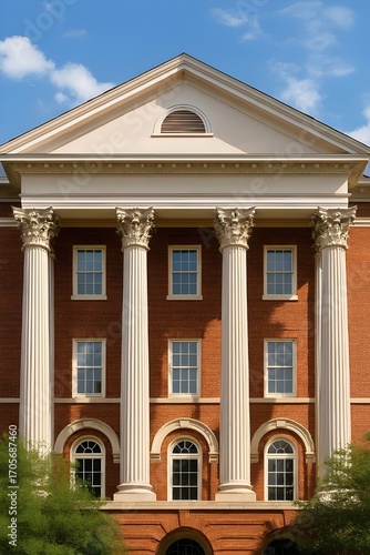 Classical building facade with columns and architectural details, showcasing traditional design and historical significance against a blue sky