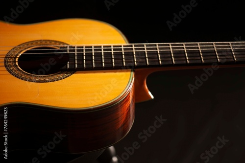 Classical Spanish flamenco guitar close up, dramatically lit isolated on black background with copy space.