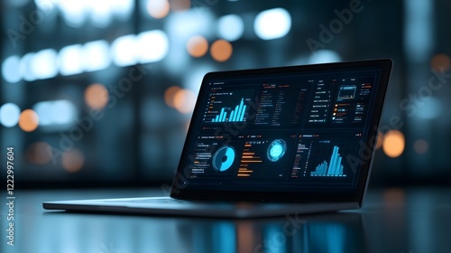 Clean and Minimalistic Data Dashboard Interface on Laptop Computer with Abstract Blue Glow