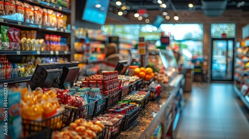 Clean and Organized Drugstore Checkout Area with Cashier Counter, Shopping Baskets, and Tempting Impulse Buy Items