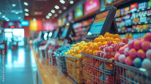 Clean and Organized Drugstore Checkout Area with Cashier Counter, Shopping Baskets, and Tempting Impulse Buy Items