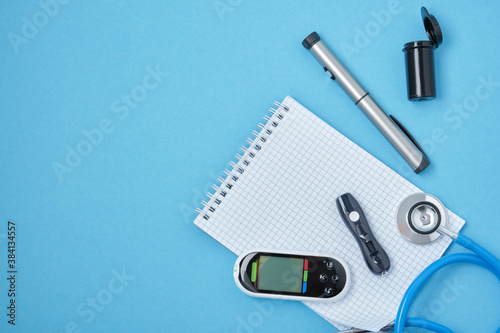 clean block with spring, stethoscope, glucose meter, lancet and syringe pen with insulin on a blue background, daibet day concept, diabetes diagnosis