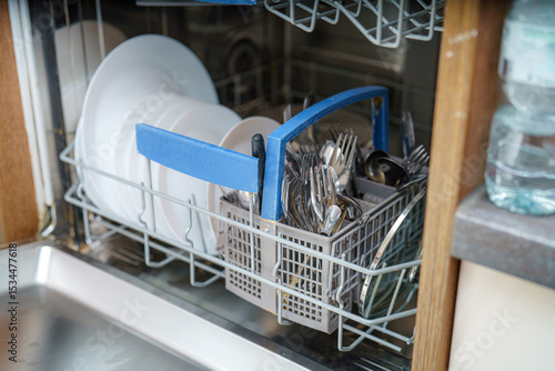 Clean dishes and utensils being organized in a dishwasher after a busy meal preparation in a modern kitchen