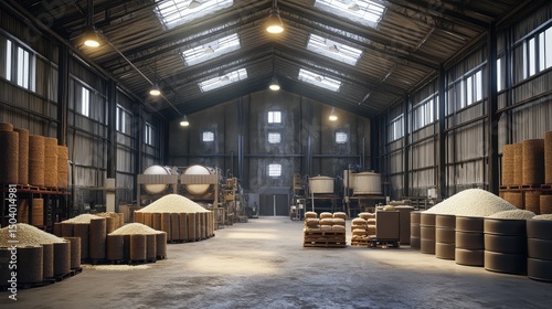 Clean factory scene with several automated rice mills under overhead lights