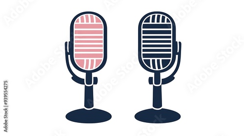 Clean Flat Vector Microphone Icon in Pale Pink and Dark Blue Colors on White Background. Minimalistic Design with Low Details.