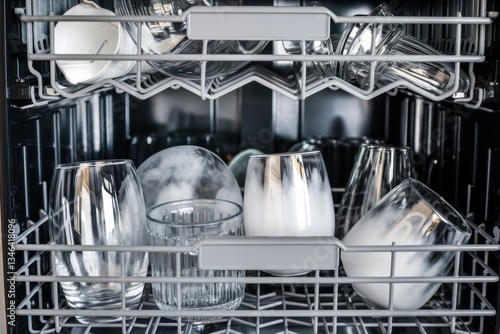 Clean glassware loaded in dishwashing machine after dinner cleanup in a modern kitchen