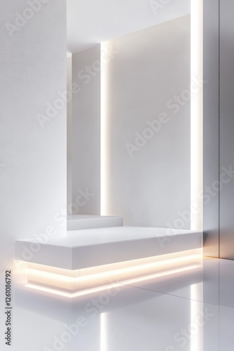 clean glowing platform in white and silver tones accented by sleek modern lighting surrounded by wide copy space