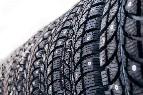 Clean new modern studded winter tires in row. Tires with spikes, close up, isolated
