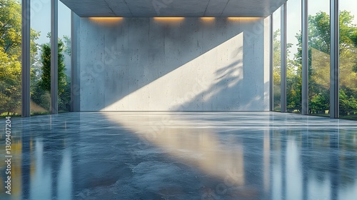 Clean open room with a textured concrete wall, light reflections on a smooth floor, and whiteboard frames for design presentations, 3d render
