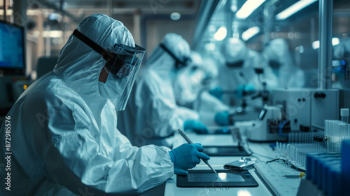 clean room in a semiconductor lab with engineers in protective suits using laserguided machinery to create microchips