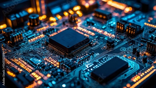 Clean, vibrant macro shot of a motherboard's glowing pathways and electronic details.