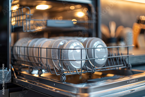 Clean white dishes in an open dishwasher