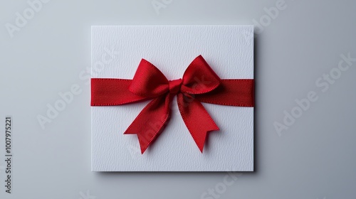 Clean white Christmas card with a red ribbon bow in the center, Minimalist holiday card, simple elegance