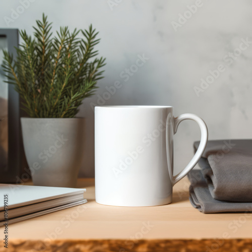 Clean white coffee mug mockup on a minimalist backdrop, styled with warm lighting and a cozy feel.