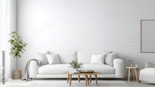 Clean, white living room with simple, modern decor. White couch with plenty of space for adding text. High-quality photo.