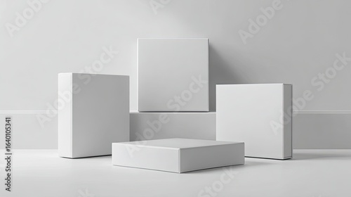 Clean white product display pedestals and boxes arranged for modern retail presentation and branding opportunities, creating an elegant minimalist studio setup.