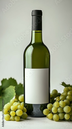 Clean wine bottle mockup with green grapes and white background, natural product styling for boutique label branding and minimalist winery presentation