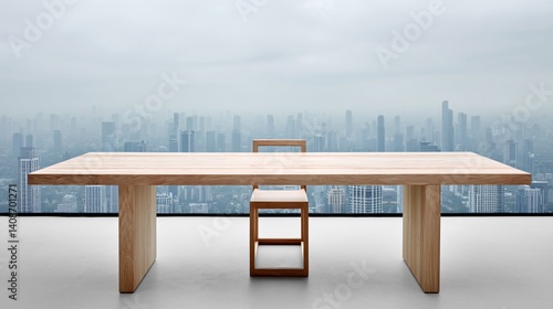 Clean workspace minimalist wooden table/chair set against a cityscape backdrop, emphasizing simplicity