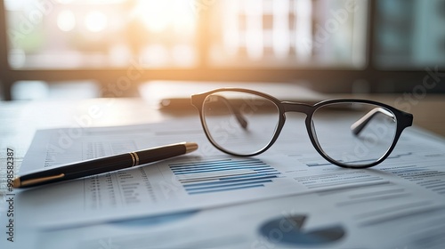 Clean workspace with a financial report, pen, and glasses neatly placed on a desk under soft lighting.