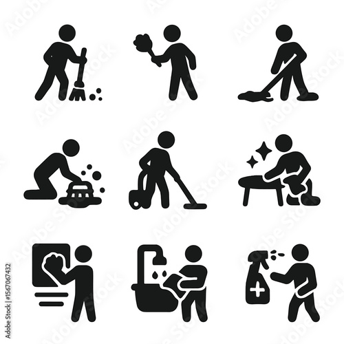 Cleaning Action Icons. Solid, filled icon set of cleaning actions: sweeping, dusting, mopping, scrubbing, vacuuming, polishing,