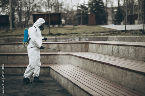 Cleaning and Disinfection at town complex amid the coronavirus epidemic Professional teams for disinfection efforts Infection prevention and control of epidemic Protective suit and mask