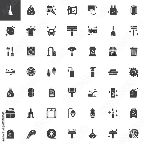 Cleaning and housekeeping vector icons set, modern solid symbol collection, filled style pictogram pack. Signs, logo illustration. Set includes icons as cleaning service, washing machine, laundry