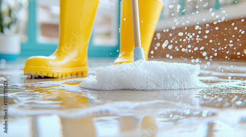 Cleaning floor with mop while wearing bright yellow rubber boots, creating cheerful and fresh atmosphere. bubbles and water add lively touch to scene