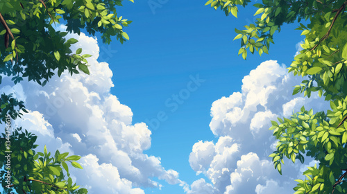 Clear Blue Sky with Fluffy Clouds and Lush Green Tree Branches in the Foreground, Creating Ample Copy Space for Text or Graphics