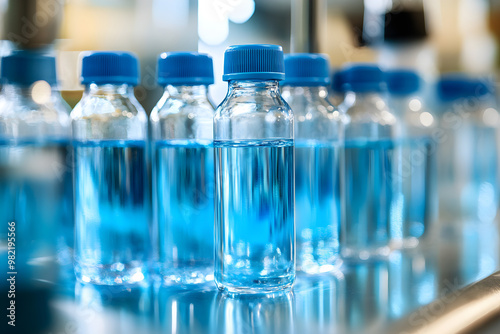 Clear bottles filled with blue water are arranged neatly on reflective surface, showcasing vibrant color and clarity of liquid. scene evokes sense of freshness and purity, ideal for discussions on wat