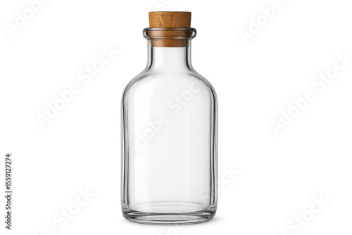 Clear empty rounded glass bottle with cork stopper isolated on transparent background, ideal for showcasing your product