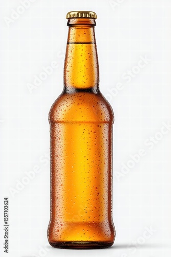 Clear glass beverage bottle with condensation droplets isolated on white background for refreshment drink packaging or product display use