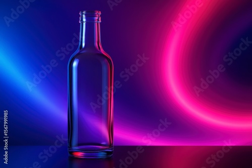 Clear glass bottle illuminated with neon lights on a dark background
