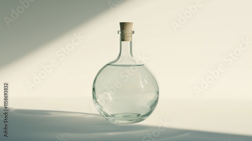 Clear glass bottle with cork stopper, half-filled with liquid, on white background.