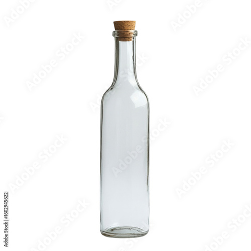 Clear glass bottle with cork stopper standing isolated against a dark background showcasing its elegant shape and transparency on transparent background