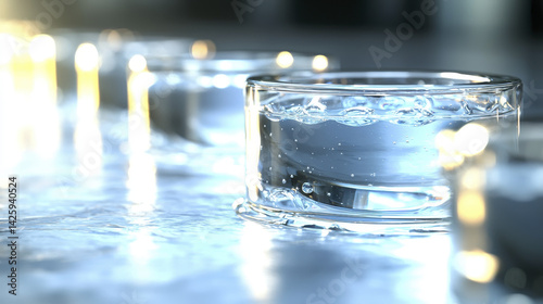Clear glass containers filled with water reflect light beautifully, creating serene atmosphere