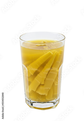 Clear glass filled with sliced bamboo shoots in liquid against a dark background. Close-up shot