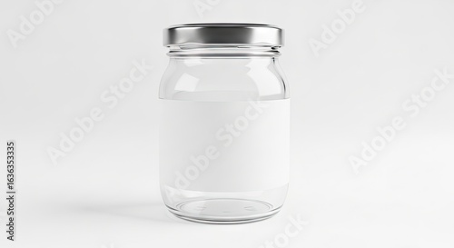 Clear glass jar with a blank white label and a shiny metal lid set against a white background