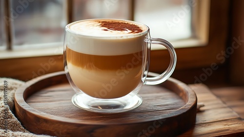 Clear glass mug with layered latte and frothy milk foam on wooden tray, surrounded by scattered coffee beans in warm setting