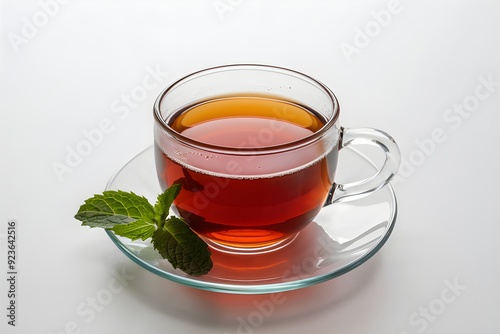 Clear glass mug with tea and mint leaf on white background, clean presentation.