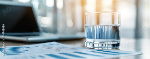 Clear glass of water with digital bar chart overlay desk with financial documents and laptop soft sunlight creating focused