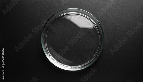 Clear glass podium on black background. Empty stage for product presentation. Mock-up. Top view.