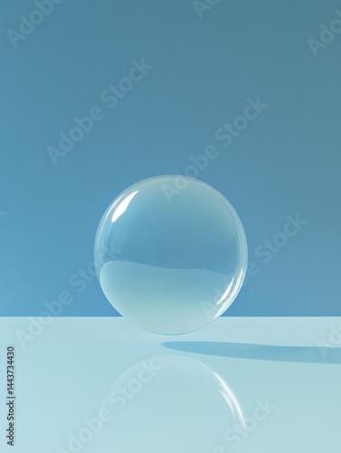 Clear Glass Sphere Floating Above Reflective Blue Surface Minimal Abstract Still Life