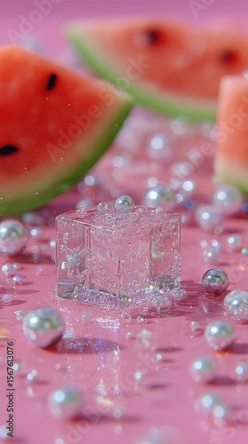 Clear ice cube, surrounded by watermelon slices and iridescent pearls, on a pink surface