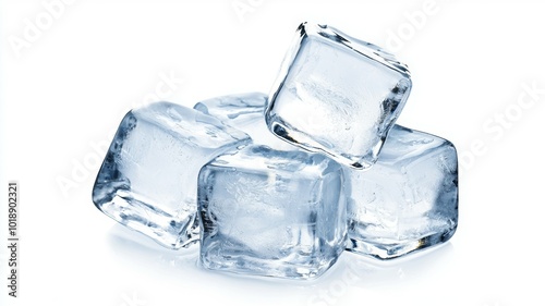 Clear ice cubes stacked on a white background for drink recipes and cooling beverages